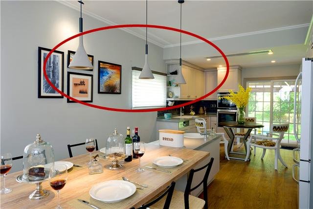15、餐厅装灯的时候一定要考虑餐桌的摆放位置, 不然灯具不在餐桌的正上方,看着更别扭。