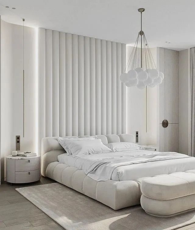 卧室中使用大面积的白色,营造舒适的休憩氛围,床头的背景墙,使空间的细节设计更加丰富,球形的白色吊灯,为整个空间带来梦幻感。黄铜材质的使用,提升了整体的格调。衣帽间依据屋主的需求量身定制,还具有梳妆台,透明玻璃与黄铜的结合,处处体现了精致细节。