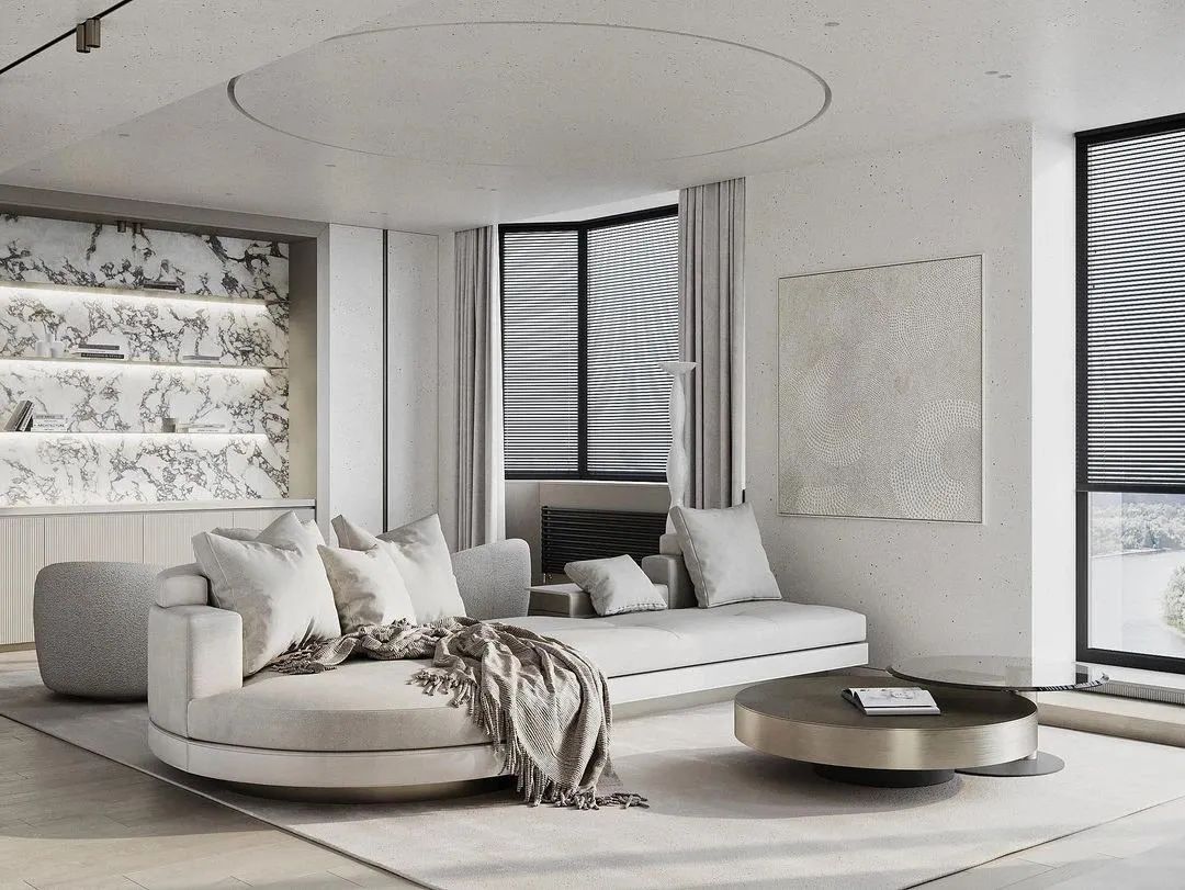 客厅使用大面积的浅灰色奠定整体纯粹的基调,一旁的落地窗,引入充足的光线让客厅显得明亮又宽敞。浅灰色的布艺沙发与黄铜材质的茶几搭配,和谐混搭各具特色,电视墙选用白色大理石纹,显露优雅轻奢气息。