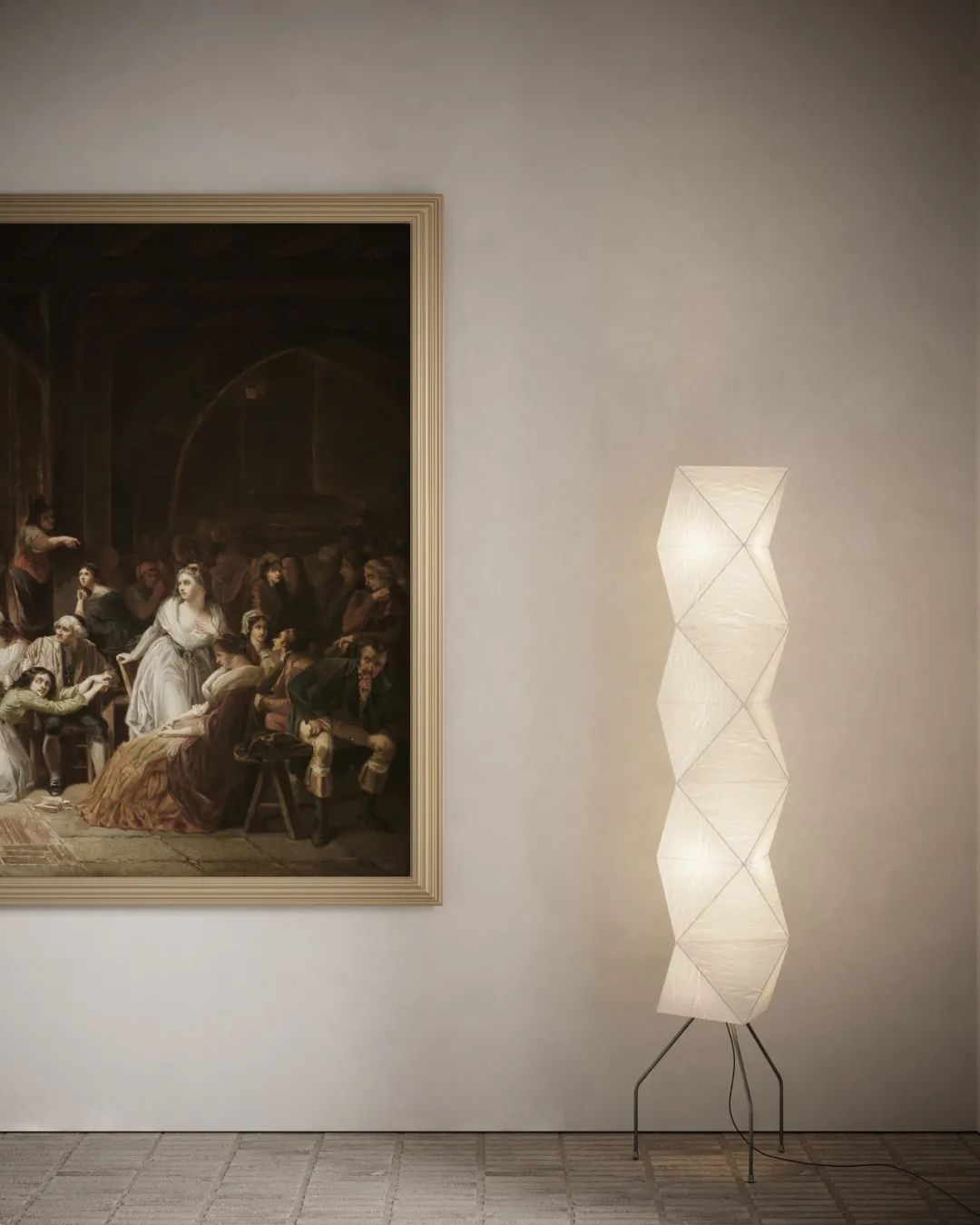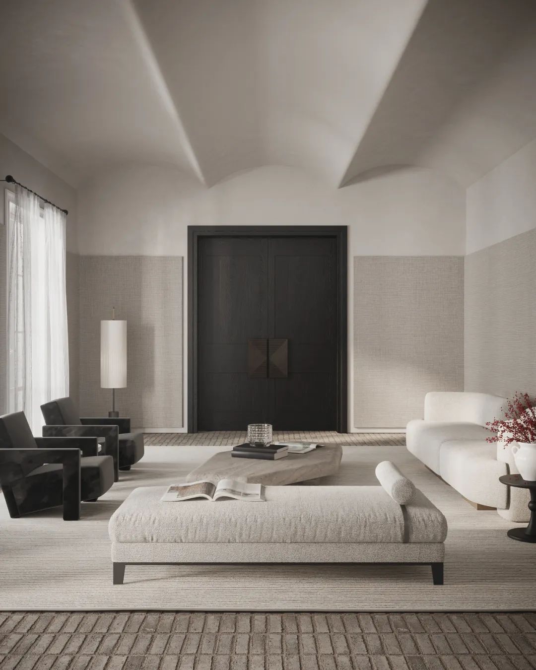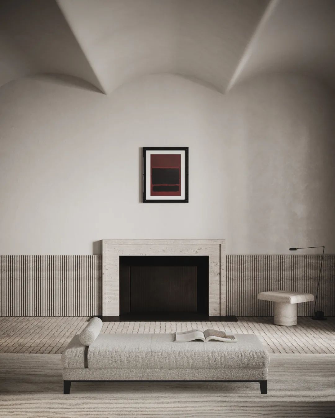 客厅中,设计师选用暖灰色作为空间的主色调,奠定整体简约的空间基调。白色的布艺沙发搭配上不规则的石质茶几,不同材质的搭配让空间显得古朴而有质感。对面的深色扶手椅与这片浅色空间形成了色彩上的对比,为屋主打造出自然舒适的社交空间,墙面上的装饰挂画,展现出空间的艺术美感。