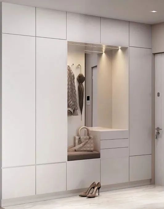玄关处设计师打造了一整座的入门衣柜,内嵌的发光璧龛可做日常的换鞋凳使用。