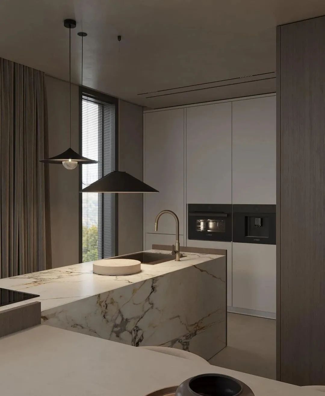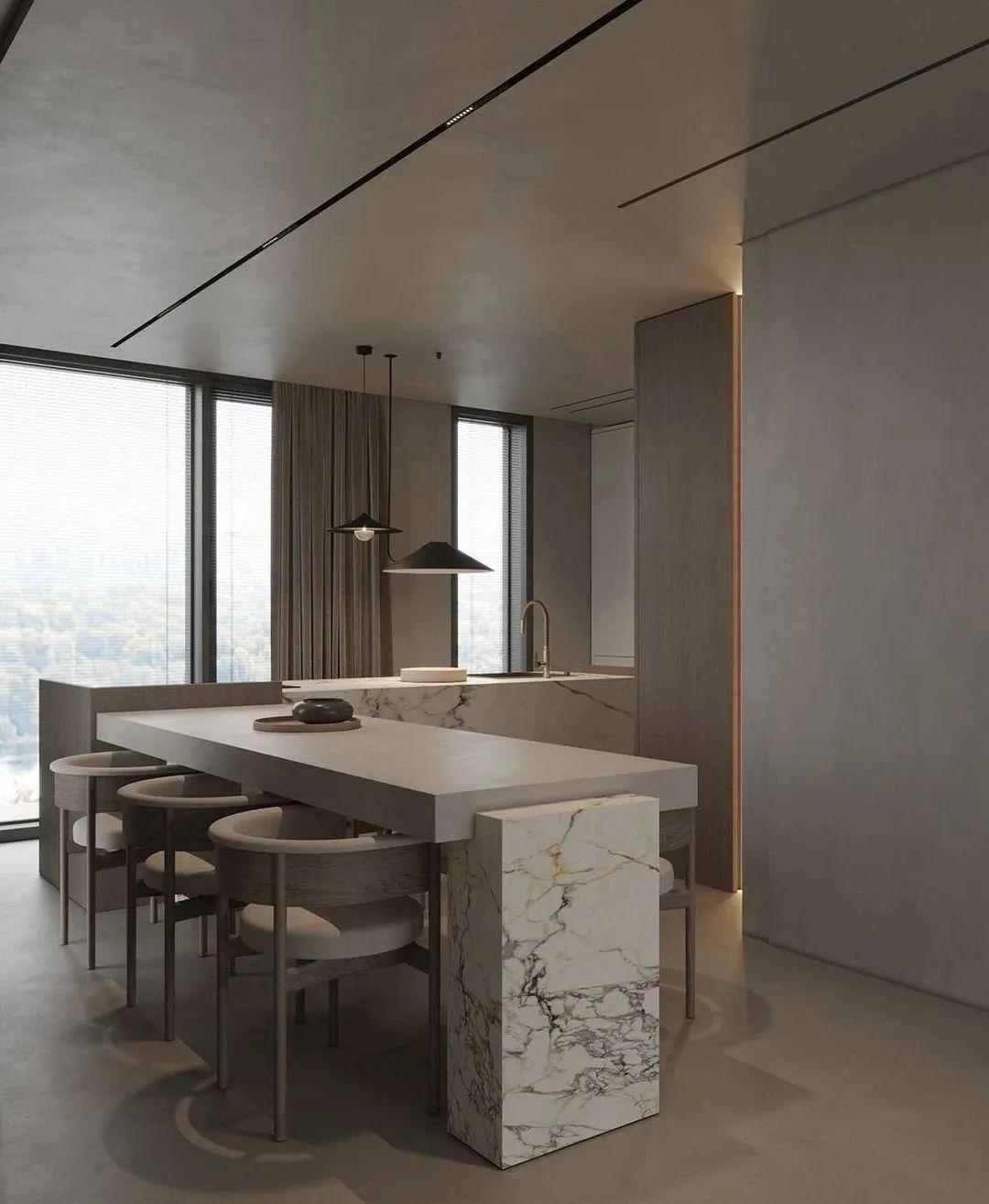 设计师选用极简主义风格塑造空间,利用原木大理石等天然材料,丰富空间的细节,提升整体的质感。简洁的形式包含复杂的系统,营造出轻盈的空间氛围。