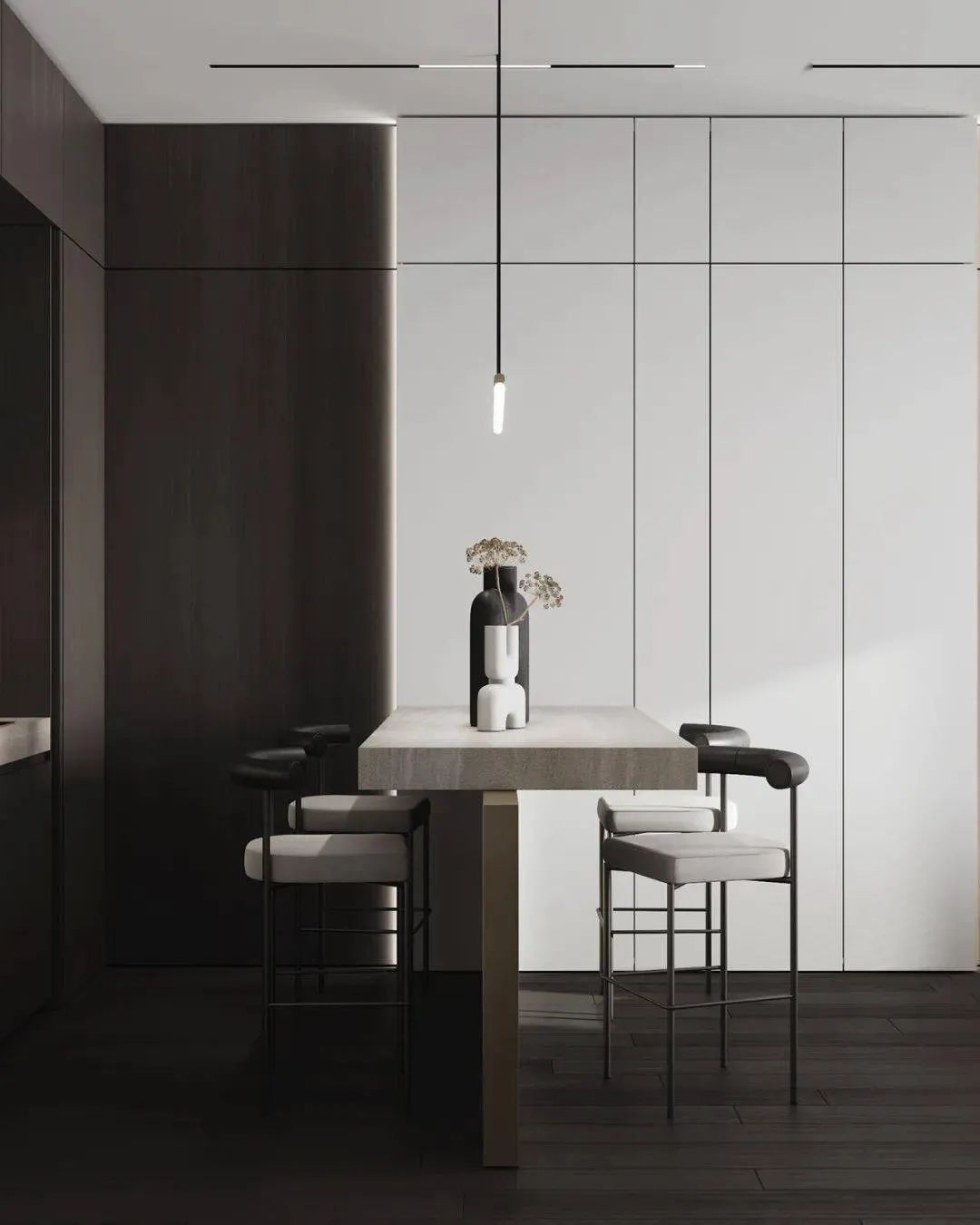 考虑到这个公寓的面积有限,设计师用到了紧邻厨房的两座吧台餐桌,在有限的范围内做出了舒适的厨房空间和就餐空间,餐桌也起到了一个隔断的作用,将厨房空间和客厅分割,金属和实木结合的餐桌椅有很强的肌理感。