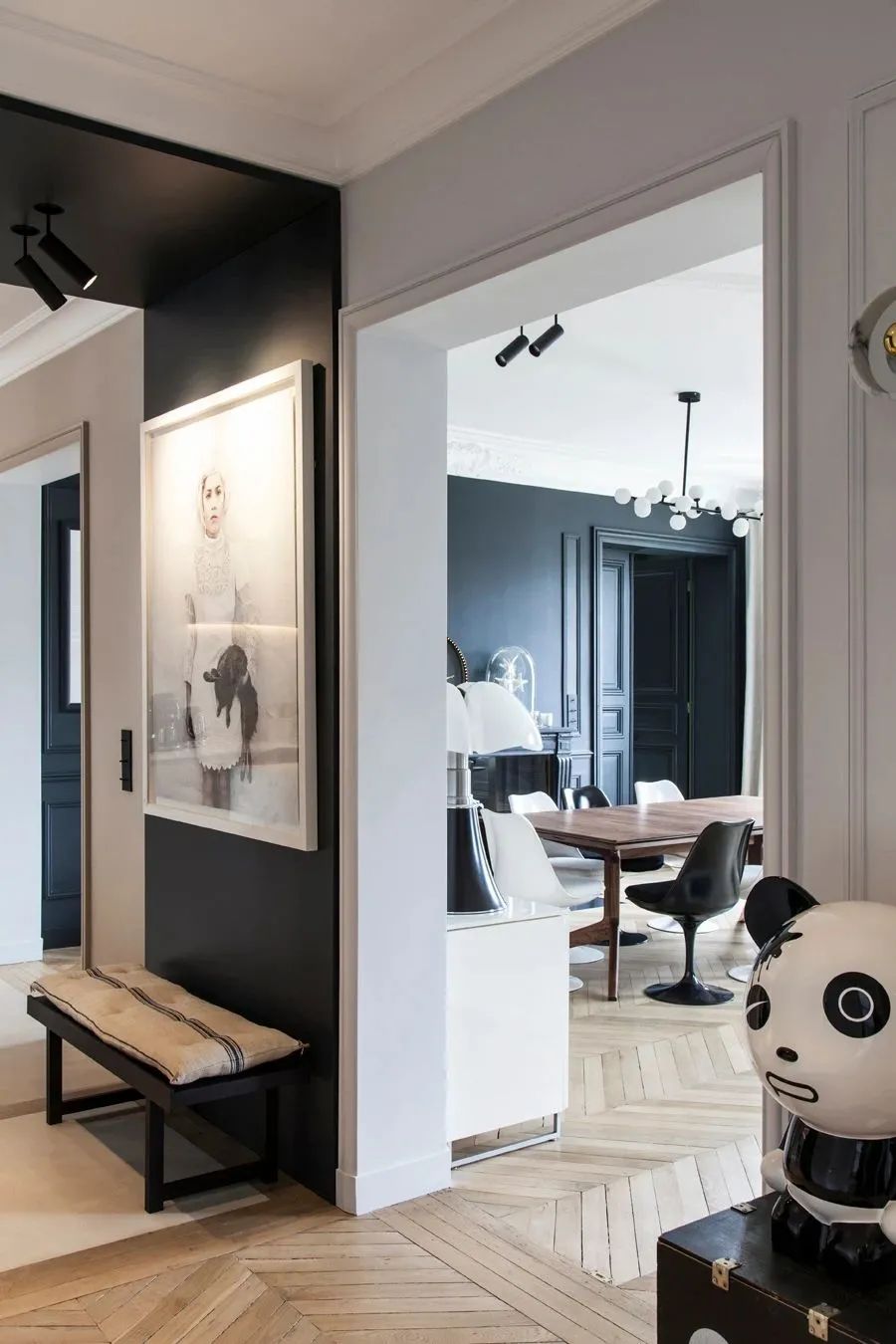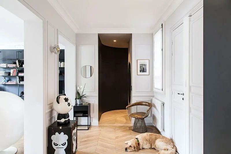 玄关处有很大的空间,以白色为主,墙面浮雕作为简单的空间丰富元素。可爱的熊猫像让回家的心情转换晴天。