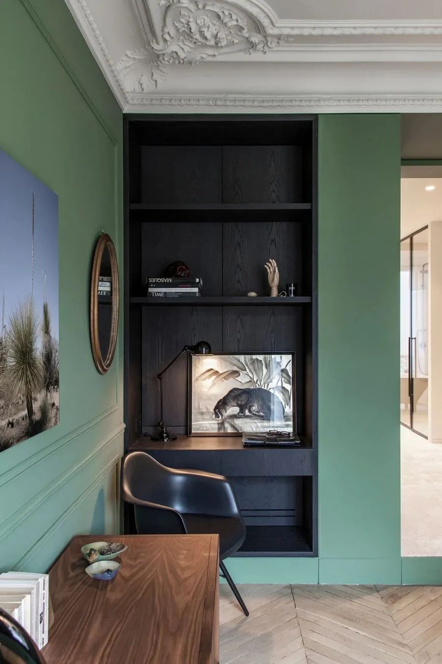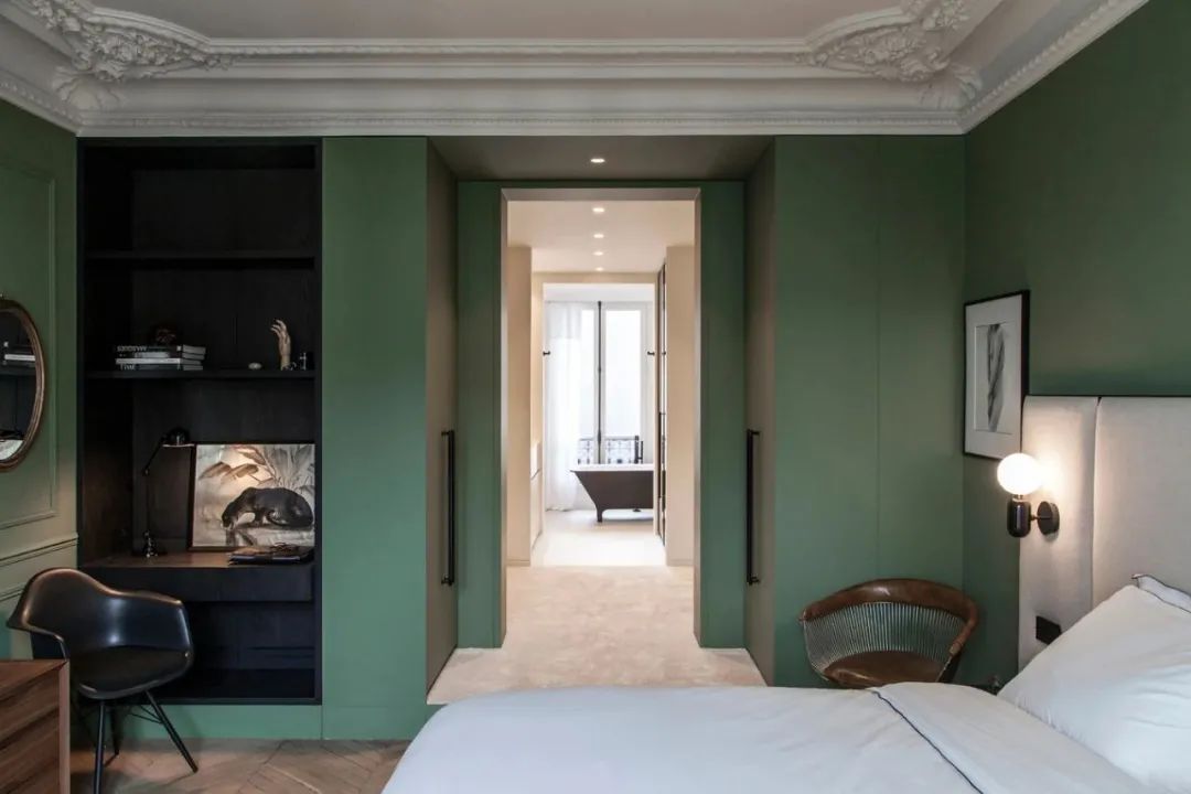 深海蓝的门推开,是浓郁的森绿主色调,仿佛进入了另一个世界。大胆的颜色创新增加了这里的节奏与吸引力,暖色的灯光与原木的家具,更是让这里多了几分丛林木屋的温馨。