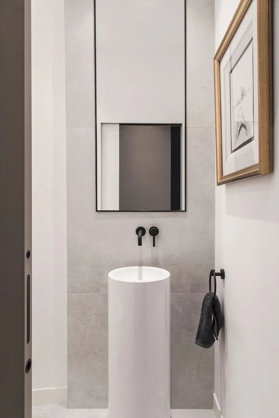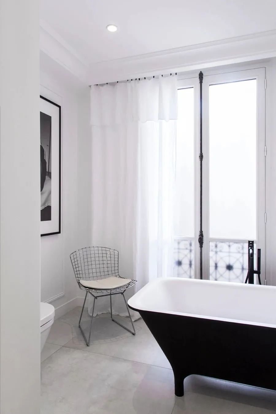 天花板的细节清晰可见,卧室与浴室相连,穿过森绿小道,干净纯洁的空间映入眼帘。经典的黑与白彰显浴室的简洁大方。干净利索地线条,带起现代地节奏。