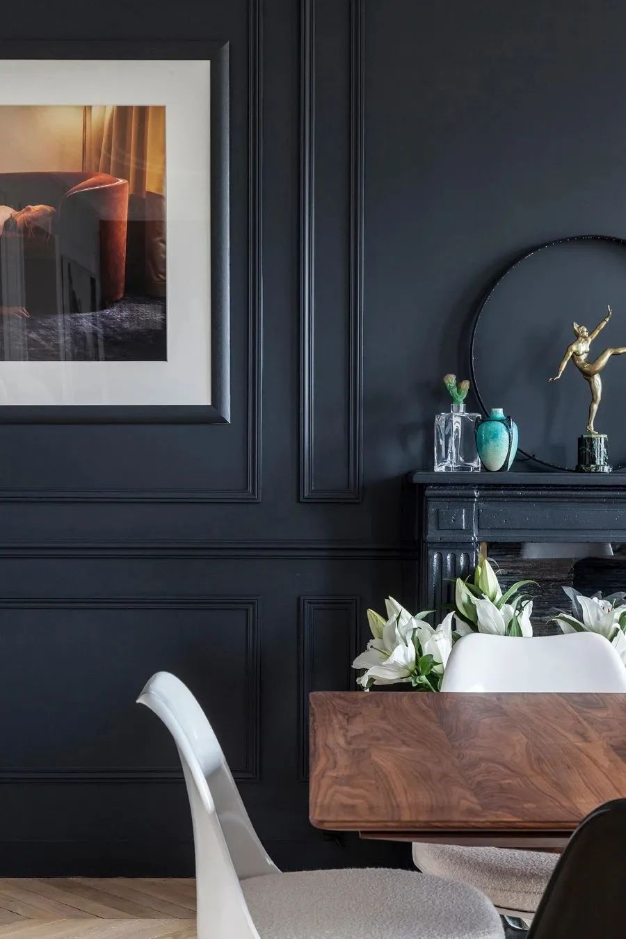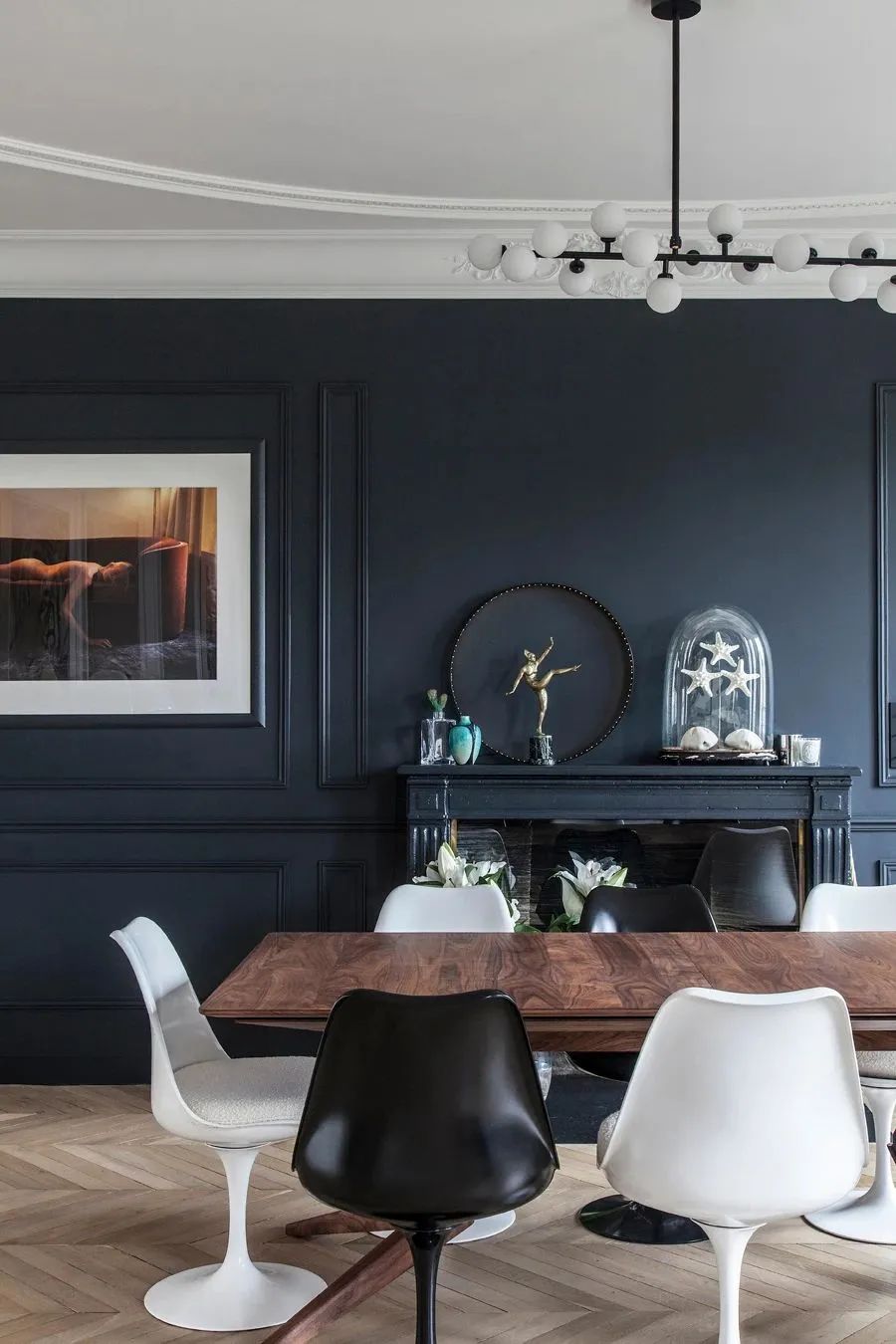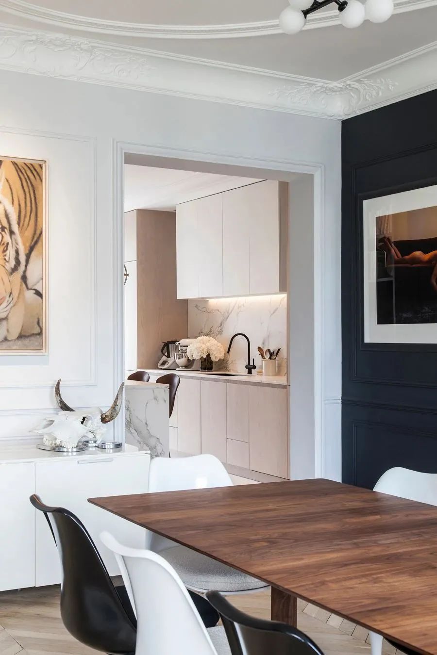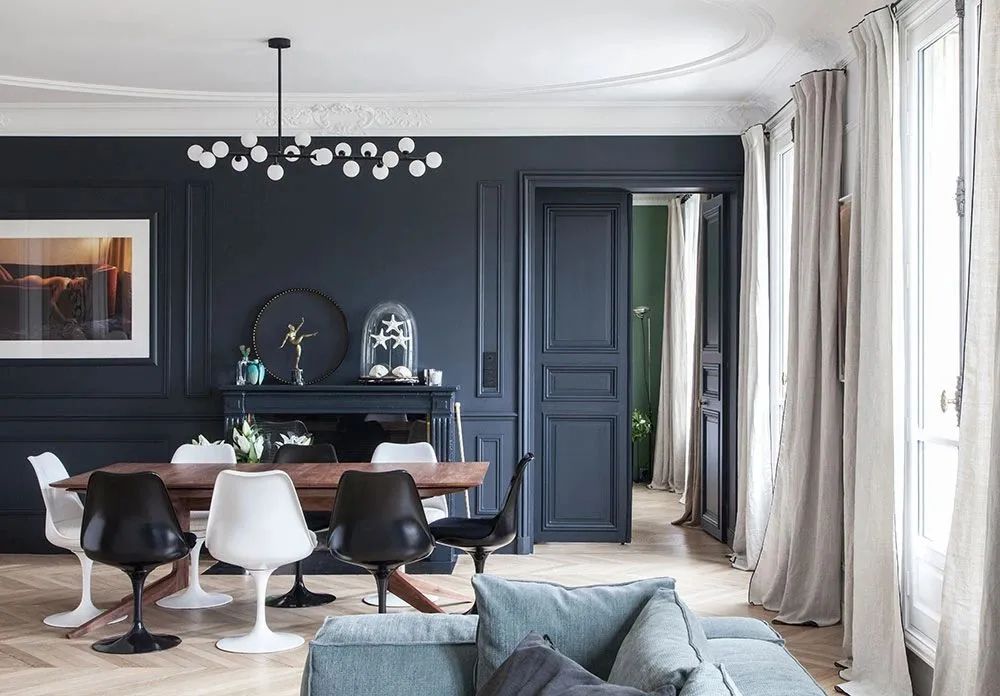 轻薄的木纹餐桌毫无负重感,搭配黑白相间的座椅,增加了这里的趣味性以及层次感。于深海蓝的墙壁而言,更加轻松自在。