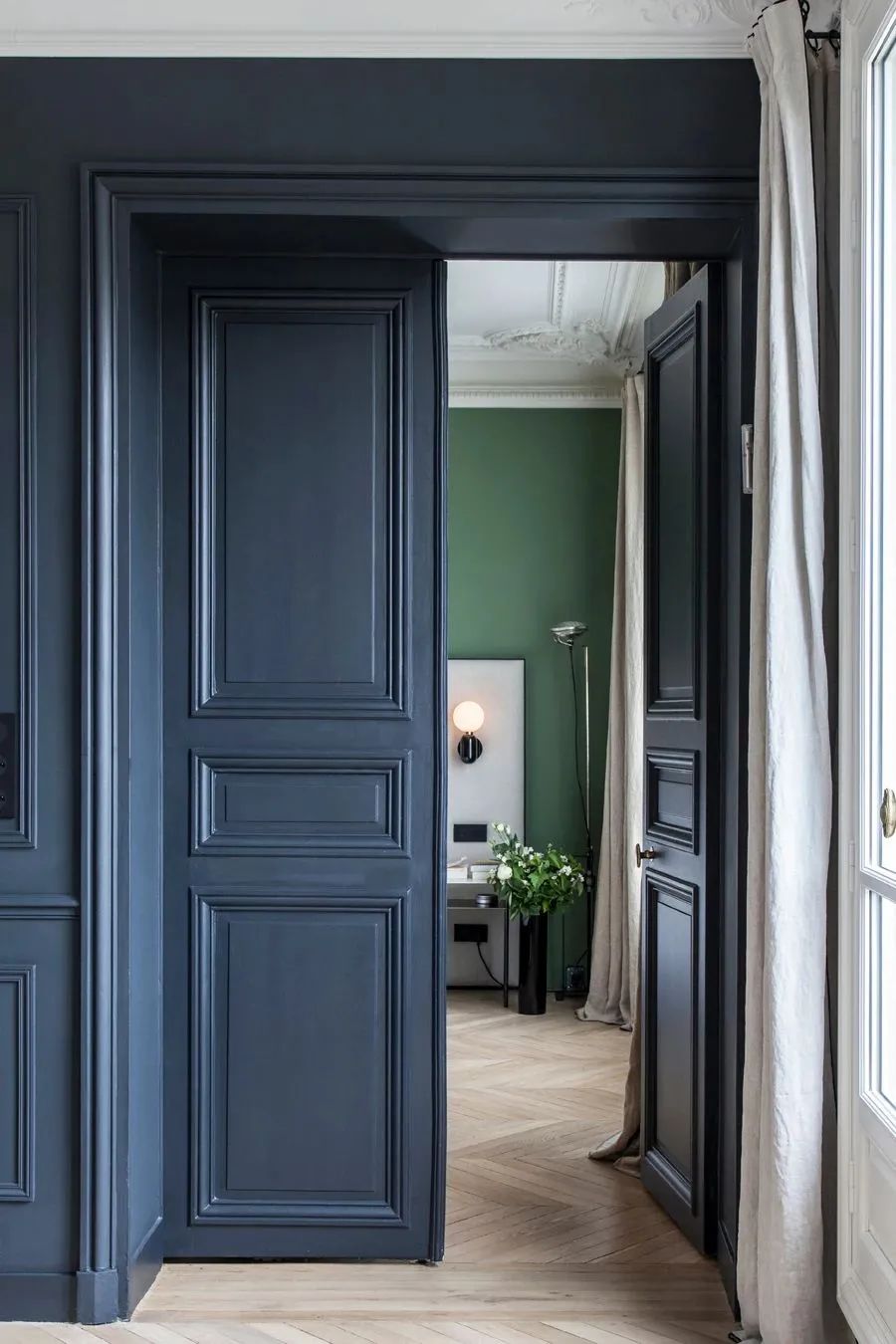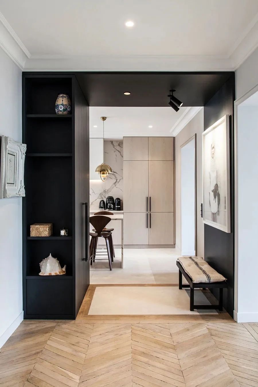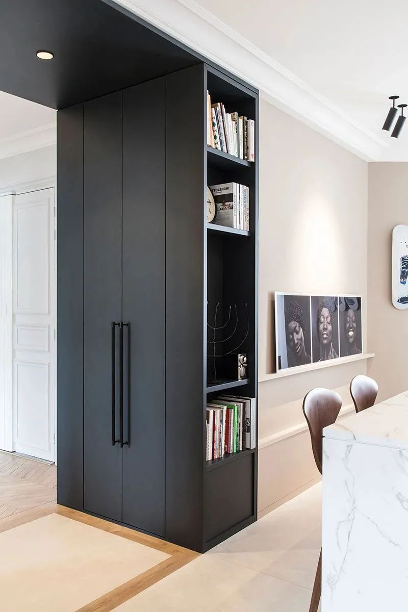 轻薄的木纹餐桌毫无负重感,搭配黑白相间的座椅,增加了这里的趣味性以及层次感。于深海蓝的墙壁而言,更加轻松自在。