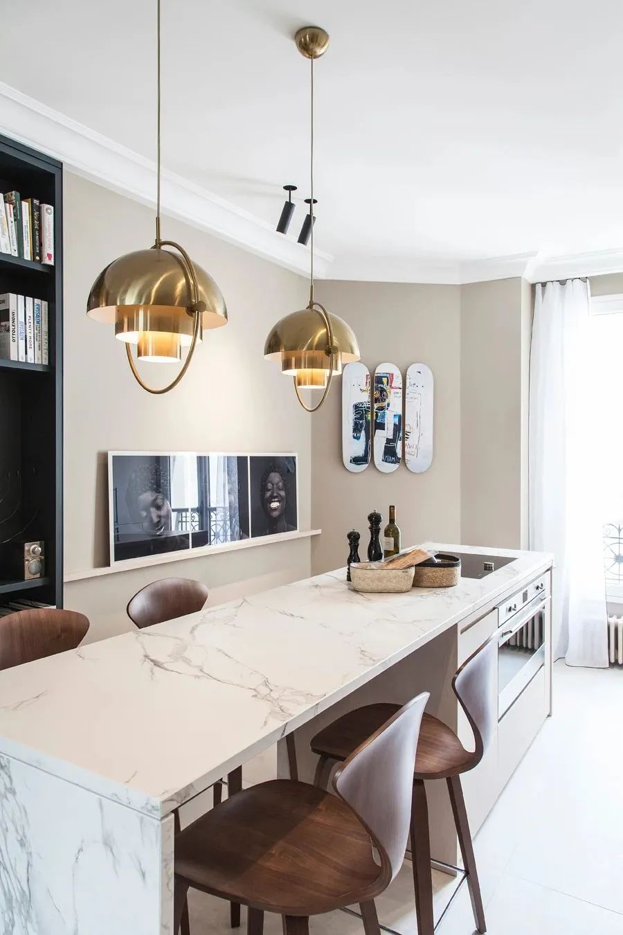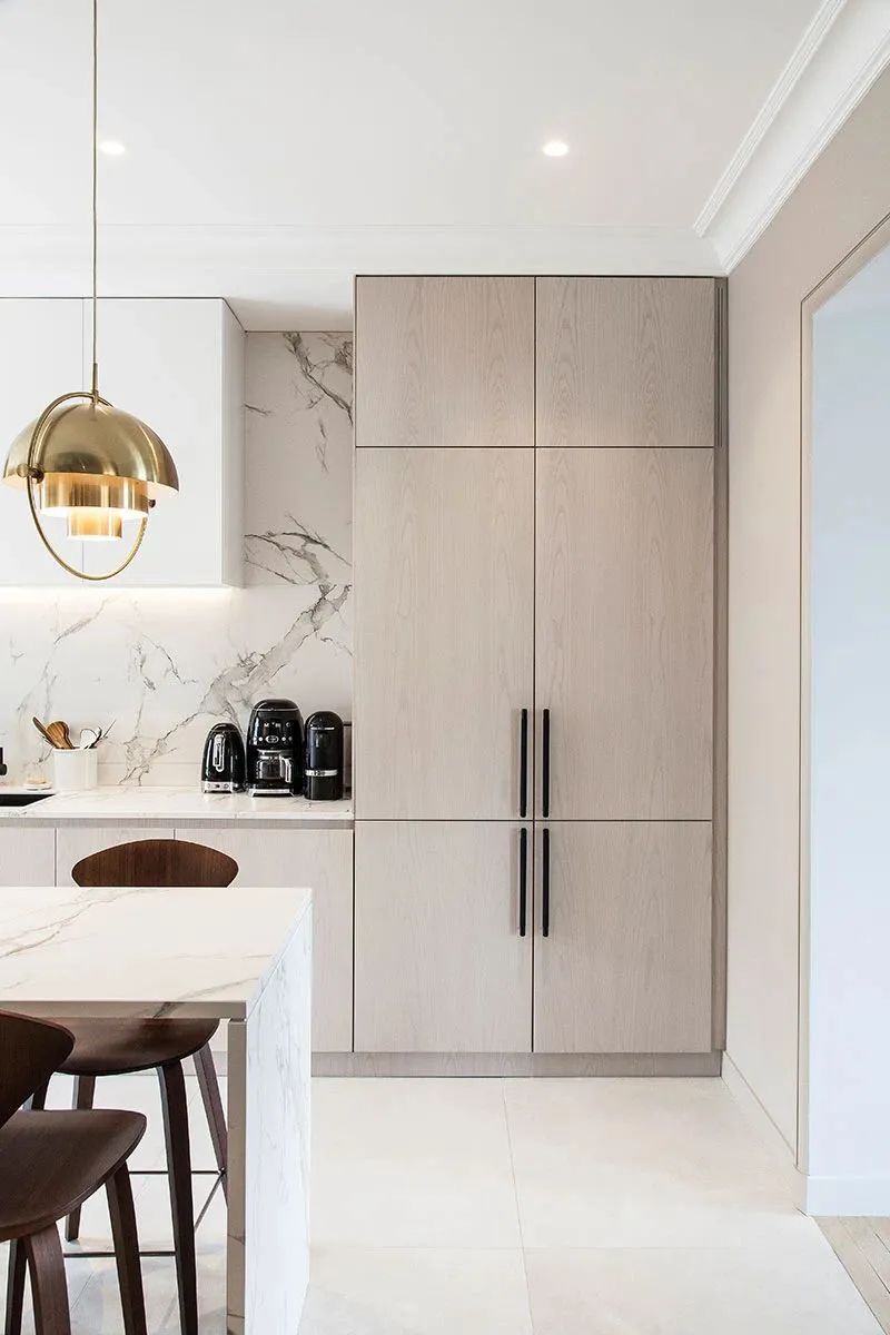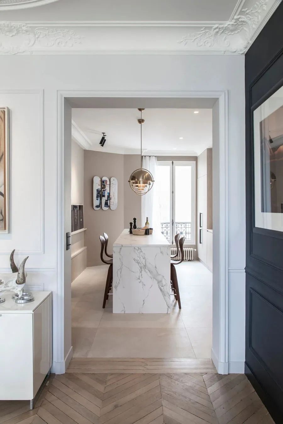 厨房与餐厅处于半开放式的空间,视野上更加开阔。天花板的浮雕纹理彰显优雅精致的情调。厨房金属吊灯为空间添砖加瓦,金属的光泽在大理石的衬托下,更加通透、明亮。