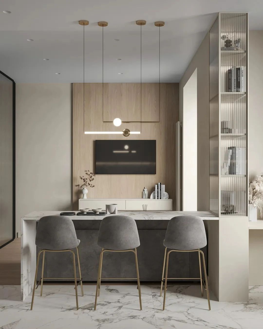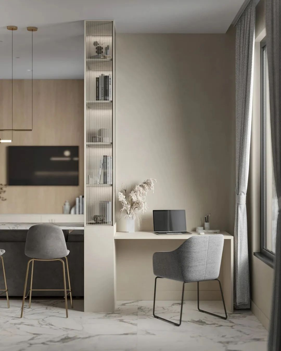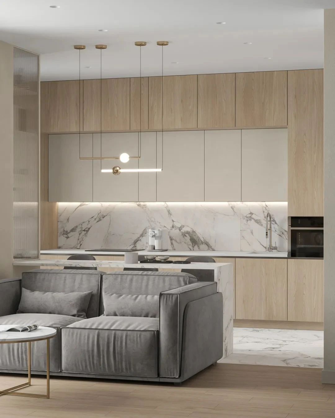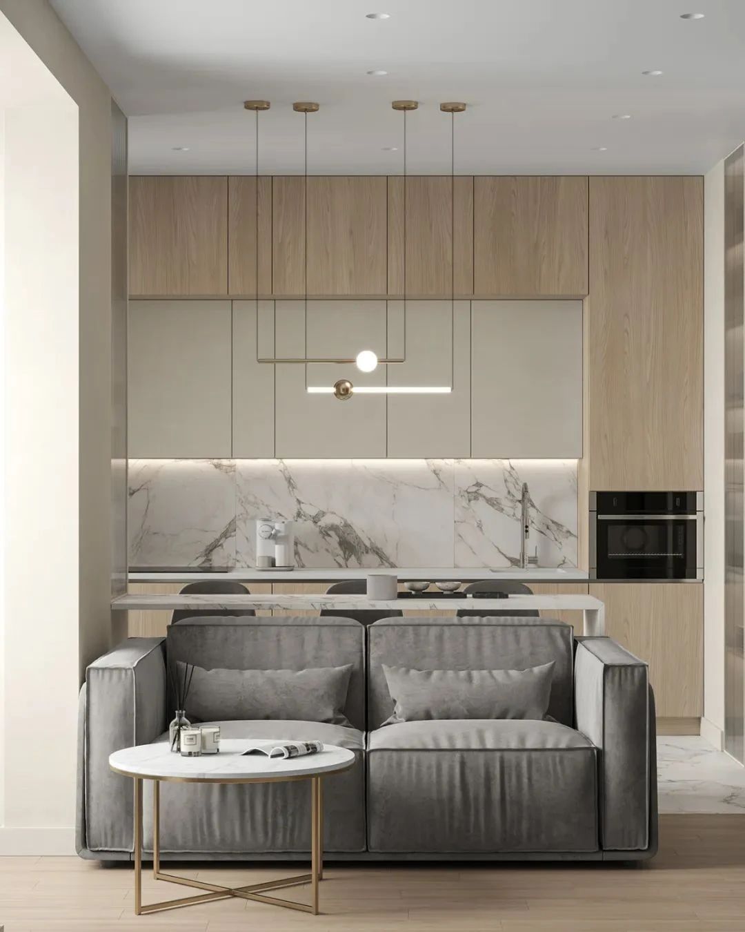 客厅中,设计师选用白色与原木色作为空间的主色调,搭配上简洁的灰色,营造现代极简主义下的温柔居所,浅灰色的小型布艺沙发搭配上白色大理石台面的小茶几,不同材质的搭配丰富了空间的细节,客厅虽小,但满足了屋主待客、交谈与休闲的功能,兼具美观性与实用性。