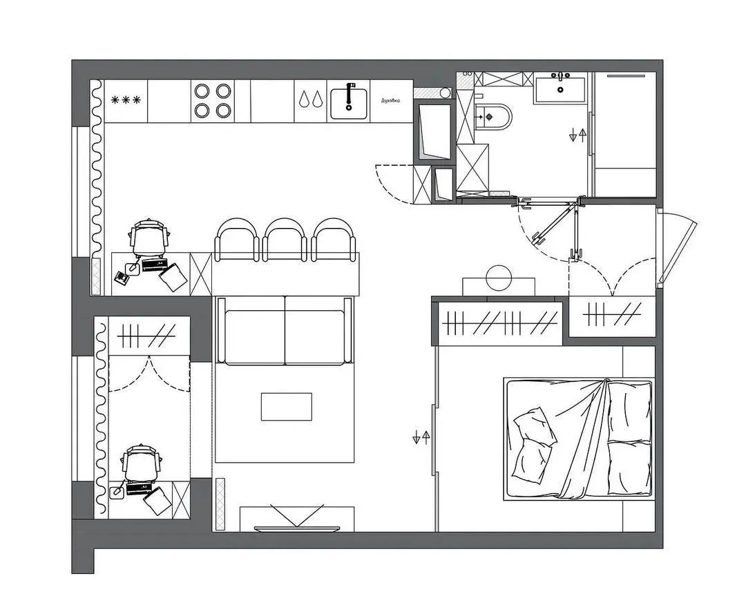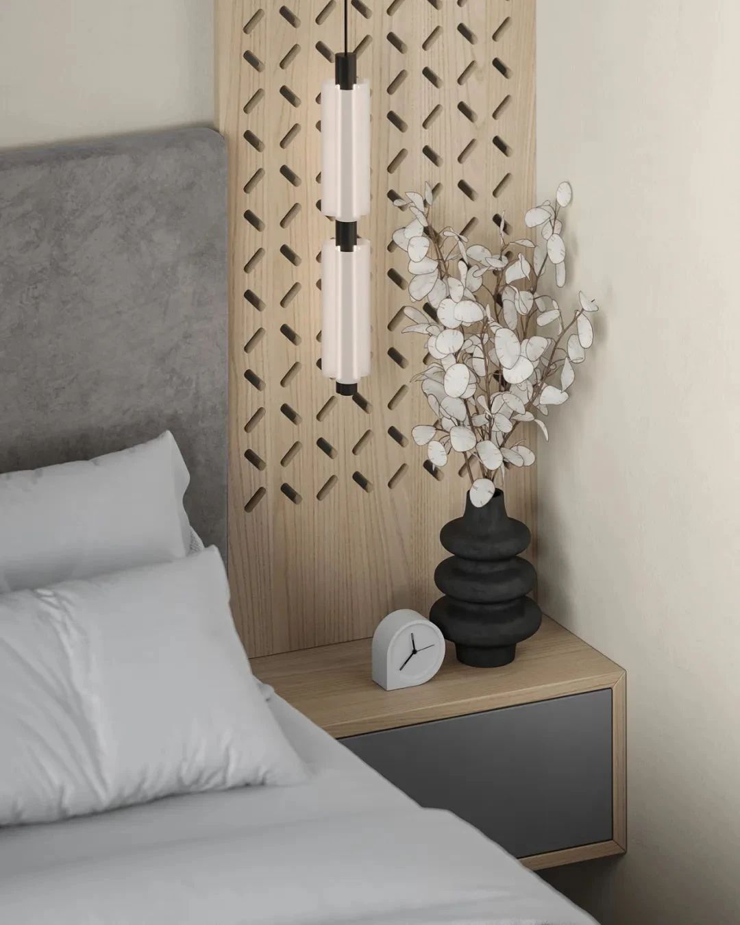 卧室之中,设计师采用了黑色金属边框的玻璃门,既分隔了空间又保证了空间中拥有充足的自然光线,给人明亮的视觉感受,白色的床品柔软蓬松,营造出了一个舒适的休憩空间。造型简洁的床头灯展现出现代极简主义下的写意美感。