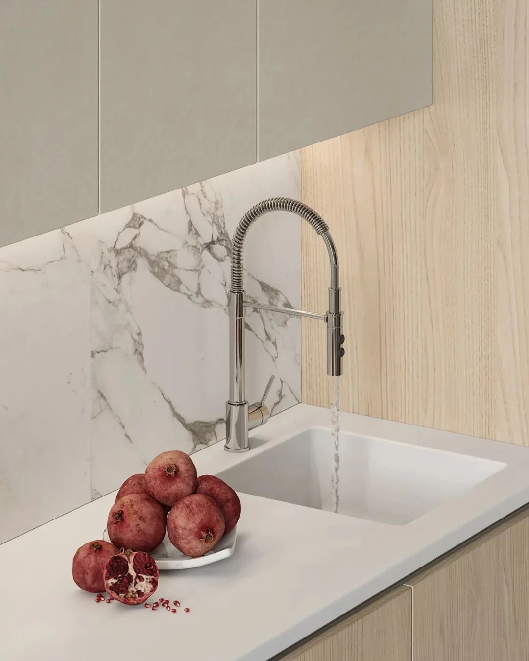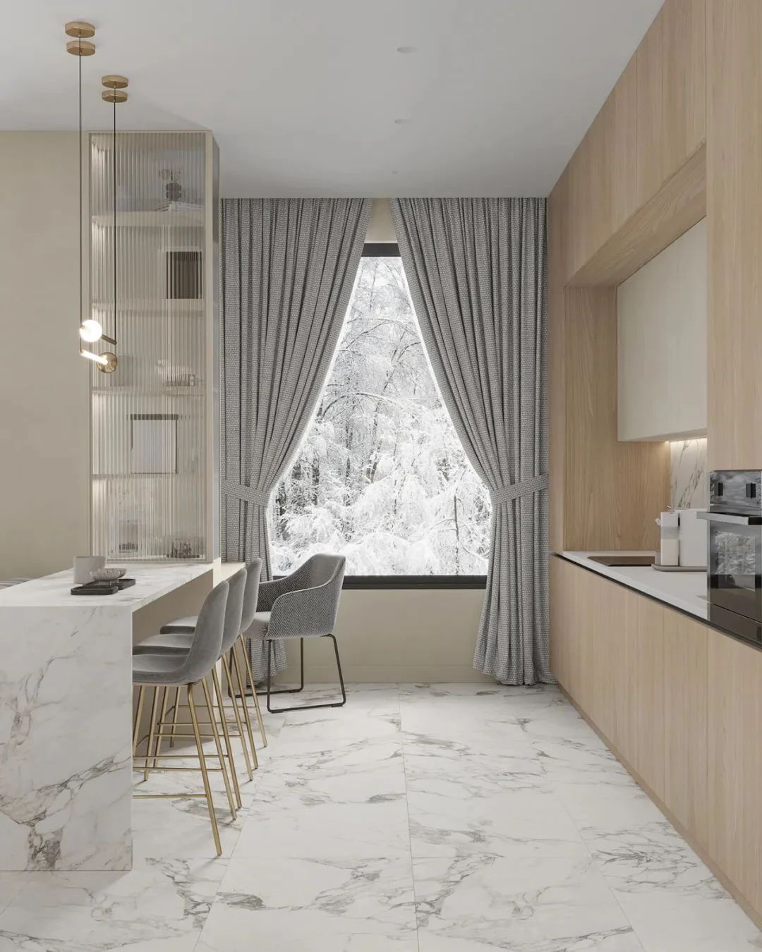 餐厅与厨房位于同一空间,在客厅的后方,开放式的设计很好地利用了不大的公共空间。厨房中,设计师选用大理石与原木作为空间的主要材质,白色的大理石地面与客厅形成了明确的分隔,餐桌与地面选用同一材质,营造具有一体性的空间。