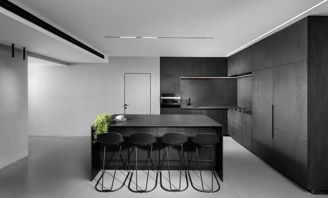 厨房依旧是延续简约的设计,黑与白的色彩拼接,利落的线条搭配上精致的家具,奠定了高度理性的空间基调,哑光黑色的大面积使用沉稳而高级。绿色植物的放置为这片灰白色的空间增添了一抹色彩,展现了极简主义下的生活美学。