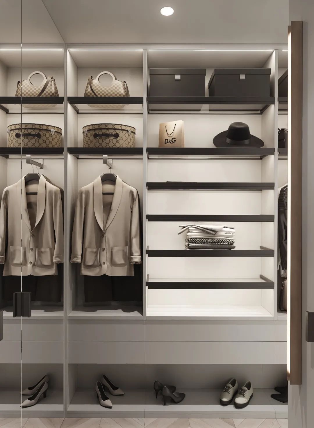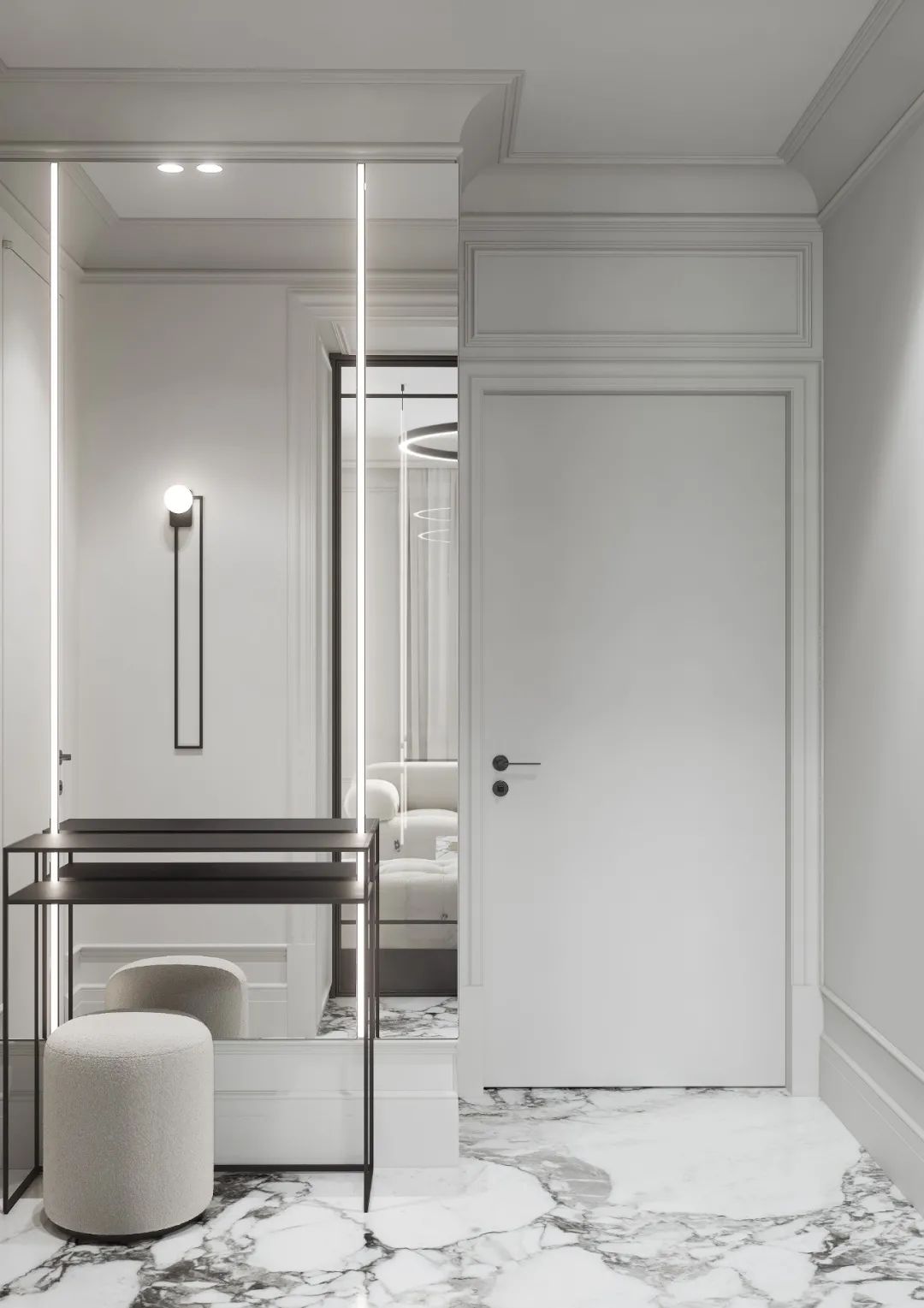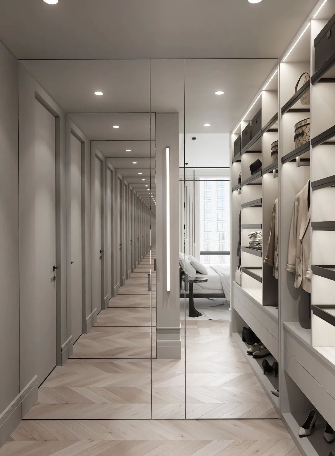 衣帽间同样沿用了木质地板与白色搭配的设计,巨大的落地镜反射出卧室走廊,显得空间更是大了许多。