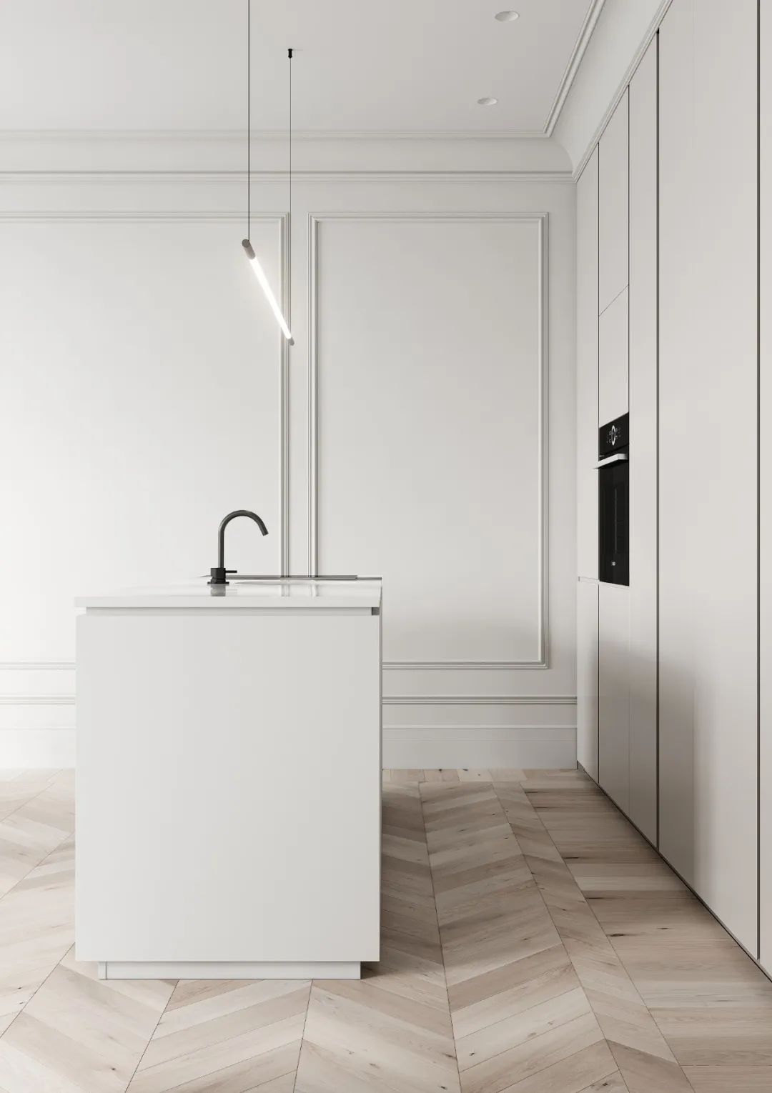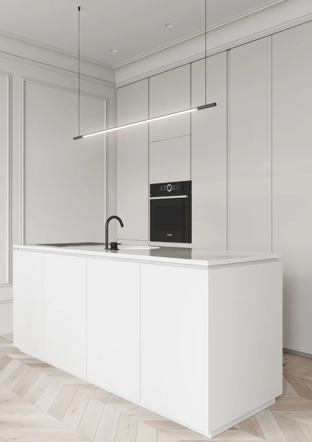 设计师在内部设计中采用了方形,同时采用了餐盘形状的吊灯,让整个客厅显得柔和简洁。客厅和用餐区以及厨房就证据了整个公寓的一半。