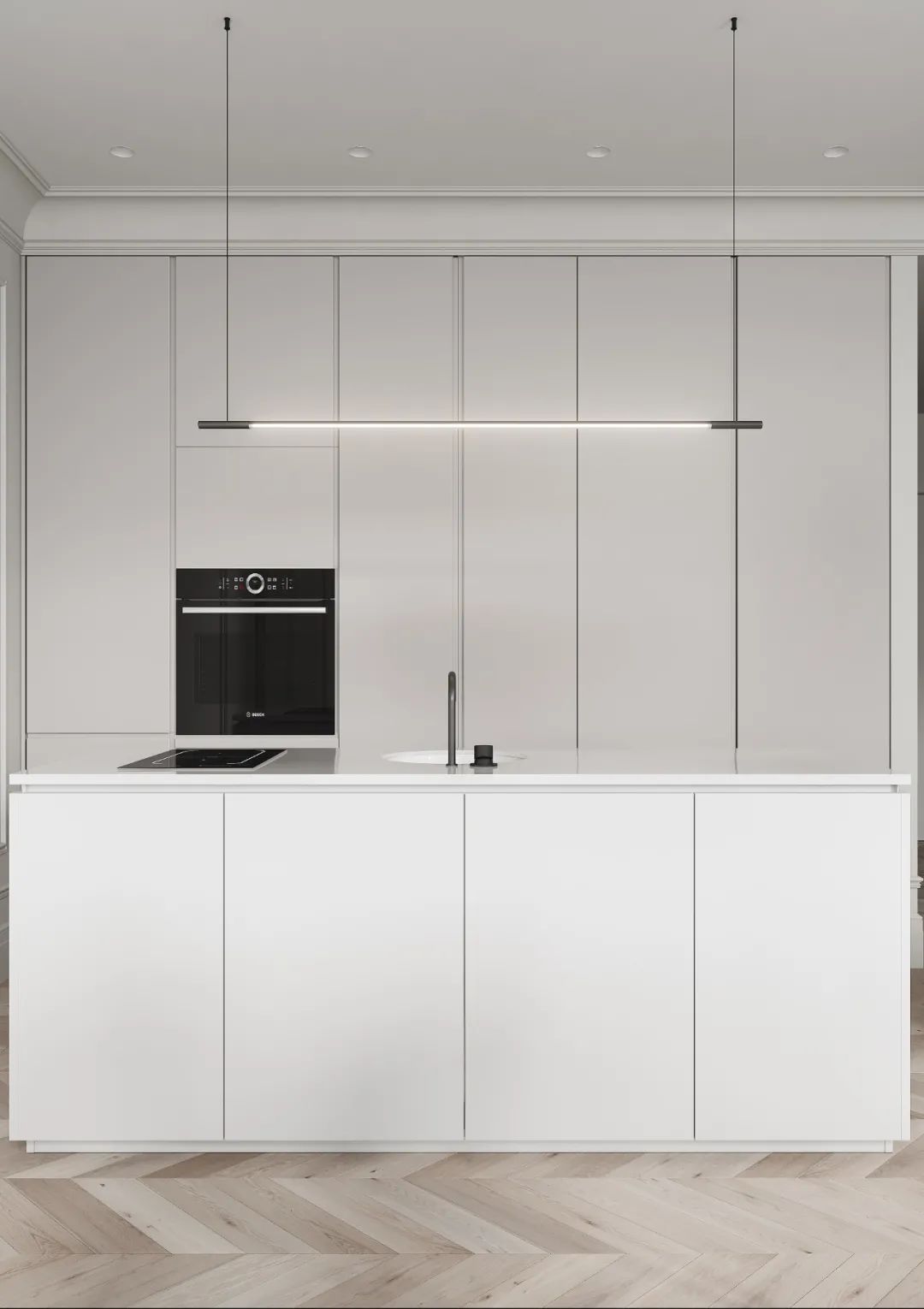 踏入客厅,极强的艺术氛围包裹了整个空间,精致的餐盘式吊灯,哑光的喷漆餐桌,极简的平面天花板,都强有力地烘托出用餐区域的美感和精致感。