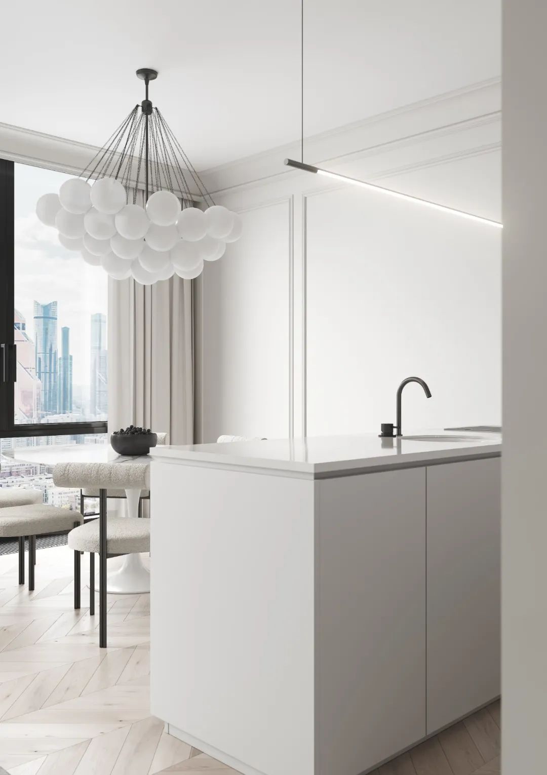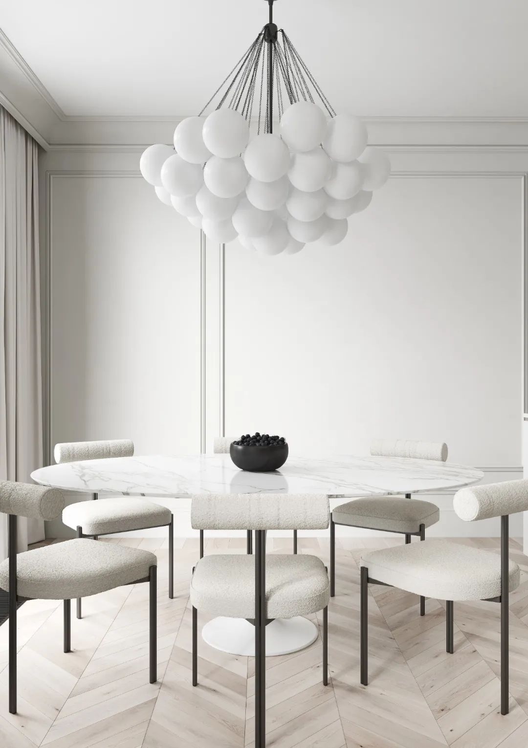 具有氛围感的用餐区域,多个球形组成的巨大吊灯给予温暖的居家灯光;错落有致的木纹地面,打破了整个空间的白,显得有了温度。